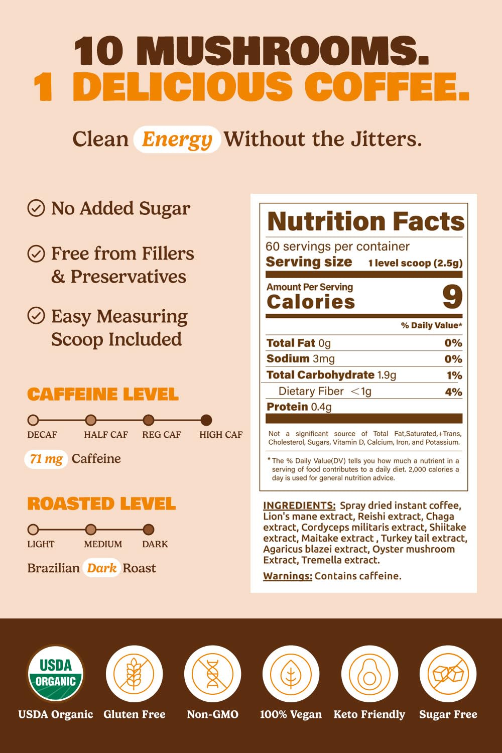 Smooth, Crash-Free Energy: Skip the jitters. Our regular caffeine mushroom powder for coffee delivers natural energy and mental clarity with 71 mg of caffeine—perfect mushroom coffee for midday focus. Cafe de hongos para bajar de peso.